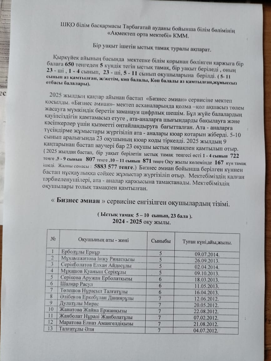 2024-2025 оқу жылындағы тамақтану